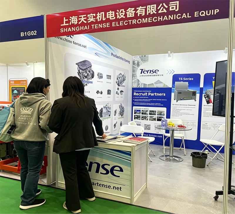Shanghai Tense Electromechanical Equipment Co., Ltd. (Shanghai Tense) presented its industrial cleaning equipment at Booth B1G06, highlighting its core products such as ultrasonic cleaners and spray cleaning equipment. During the exhibition, numerous professional visitors and purchasers in the fields of auto maintenance, parts manufacturing, and auto care stopped to negotiate, gaining in-depth insights into the performance, application scenarios and technical advantages of Tense’s cleaning equipment, with a warm atmosphere for on-site communication.